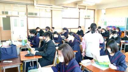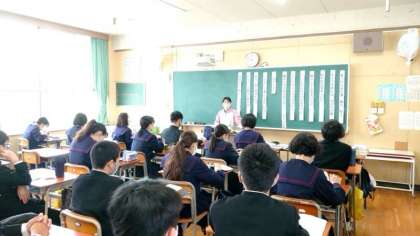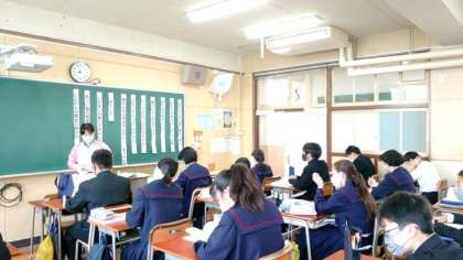 2年生国語の授業で、詩人新川和江さんの「名づけられた葉」を鑑賞中。まずはみんなで音読し、詩の世界を味わいます。詩に曲がつけられて、合唱曲としても有名だそうです。作者のメッセージをみんなで考えましょう。