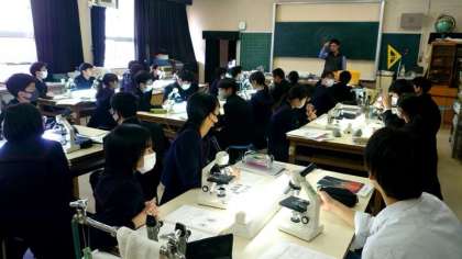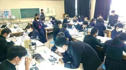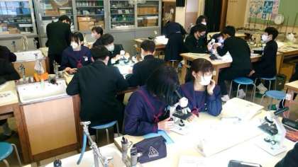 3年生の皆さんが理科室で顕微鏡をのぞいています。タマネギの根の先端を使って、細胞分裂の様子を観察します。レンズの倍率を調整し、プレパラートの標本を見つめます。皆さん、上手く観察できましたか?