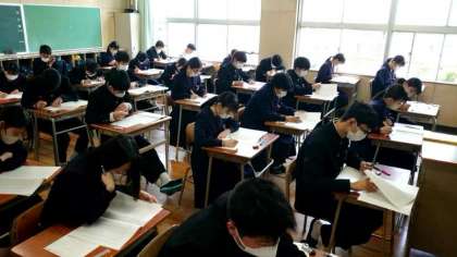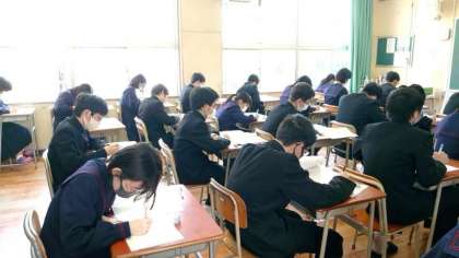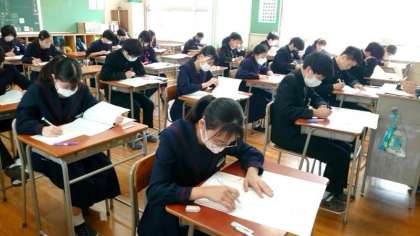 1時間目、国語のテストが始まりました。各教室では静かにペンを滑らす姿が。今日は「国・数・英」とふだんの学習に関する質問調査が行われます。午前中の4時間、皆さん集中して取り組みましょう。