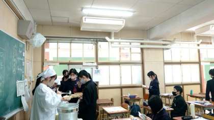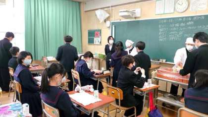 お昼のチャイムが鳴り、お待ちかねの給食の時間。今日は「豚のガーリック焼き・鶏のスープ・豆とコーンのサラダ」の洋食メニュー。1年生の教室では給食の配膳中。小学校と違ってお昼休みが短いので大変かと思います。皆さん、少しは慣れましたか?