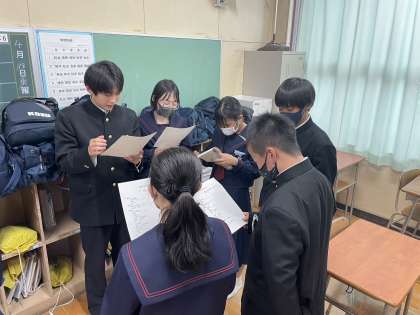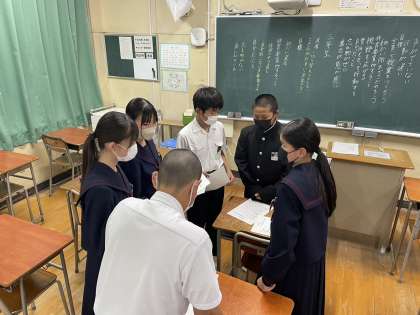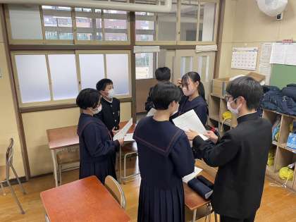 体育委員会では、授業冒頭の整列の号令やあいさつについて、先輩が後輩にレクチャーしています。先輩の説明を漏らさずしっかり聞いている後輩の姿が微笑ましいですね。