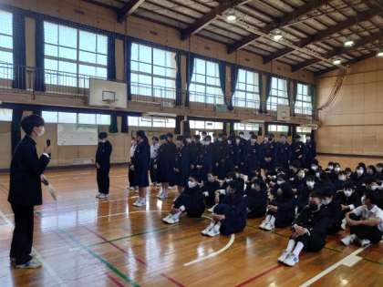 毎週木曜日の朝は2年生学年集会。皆さん、体育館に集まっていろいろなお話を聞いています。司会・進行は生徒代表が担います。スムーズな進行はさすが2年生。昨年の経験が活きていますね。