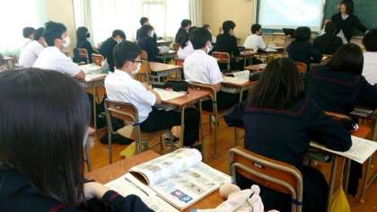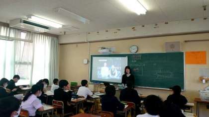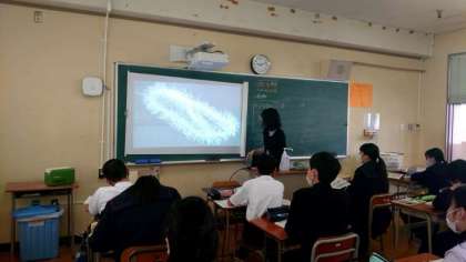 2年生理科の授業で水中の微生物について教わります。スクリーンには「ゾウリムシ」の画像が映っています。ミジンコと同じ、水中を動き回る動物性の生き物とのこと。校内の観察池で採取できれば実際に見ることができるのですが、お留守のようで残念です。