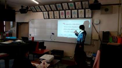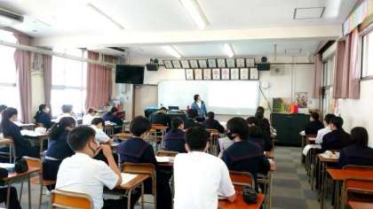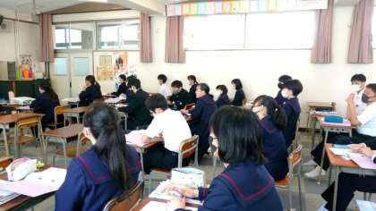 2年生音楽の授業で「サンタルチア」をイタリア語で歌います。イタリアでは、低音から高音まで美しく歌い上げる「ベルカント唱法」と呼ばれる歌唱法があるそうです。先生が歌い方をくわしく伝授中。皆さんもチャレンジしてみましょう。