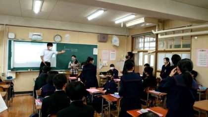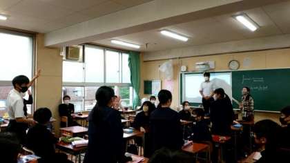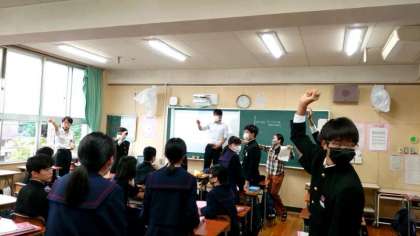 3年生英語の授業でC-NETのマージョリー先生が皆さんに英語で質問中。まずは全員が席を立ち、上手く英語で回答出来れば、vertical(縦)かhorizontal(横)の列の仲間が着席できるルールとのこと。正解できた人が次々に座っていきます。最後に残るのは誰になるでしょう?