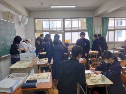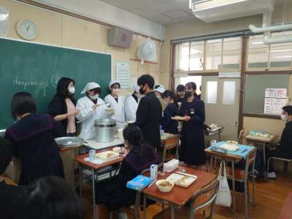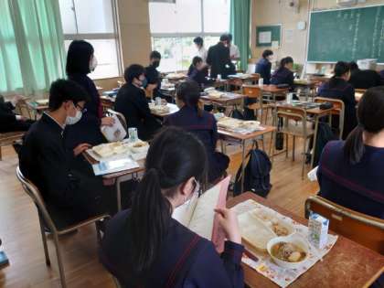お昼休みになり、お待ちかねの給食の時間です。家庭訪問やGWのため、みんなでお昼をいただくのは久しぶり。今日の献立は「肉じゃが・もやしの柚子風味和え・筍おかか」。3年生の教室では食事の準備中。皆さん、美味しくいただきましょう。