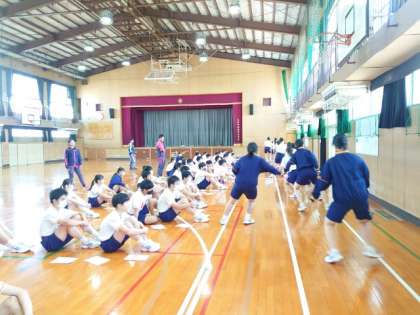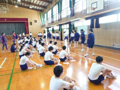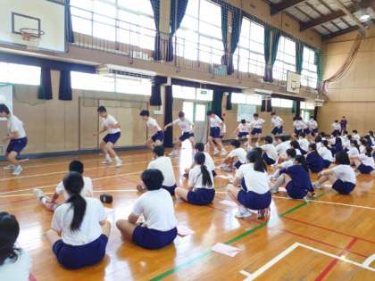 3年生体育の授業で、新体力テストに取り組みます。今日の種目は「反復横跳び」。1m間隔に引かれた3本のラインをサイドステップで繰り返し跨ぎます。時間は20秒。中学3年生の平均値は、男子56.85回、女子49.51回。3年の皆さん、平均値超えをめざしましょう!