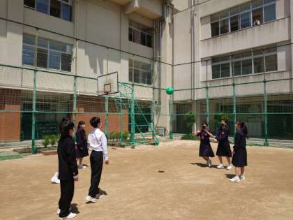 お昼休みの運動場では、生徒の皆さんが仲良く遊んでいます。貸し出し用ボールを使ってバレーボールやバスケットボールを楽しみます。快晴の下、身体を動かしてリフレッシュ。スッキリと気分転換して午後の授業も頑張りましょう。
