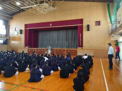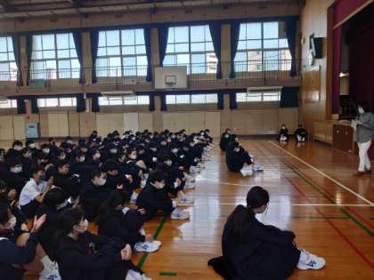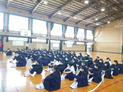 水曜の朝は1年生が学年集会を行います。入学して1ヶ月が過ぎ、中学校生活にも慣れてきた模様。今朝も定刻前に集合できていましたね。時間前行動が着々と身に付いているようで、何よりです。