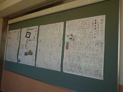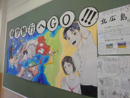 3年生の廊下に修学旅行の巨大ポスターが張り出されています。旅行で訪れる名所の数々が美しく描かれ、気持ちが盛り上がります。広島平和学習の壁新聞も掲示されており、今月24日(水)からの出発が待ち遠しいですね。