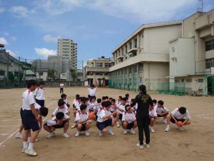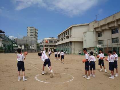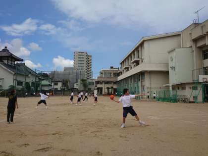 2年生男子が新体力テストのハンドボール投げを測っています。試しにキャッチボールをしていますが、腕の力だけでは遠くに投げることが難しそう。体重移動やボールを投げる角度など、いくつかコツがあるとのこと。身体を上手く使ってみましょう。