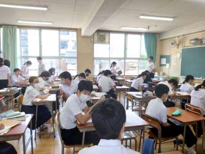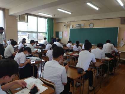 授業開始前の3年教室では、皆さんが国語のドリルを解いています。これまでの学習を振り返り、内容の定着を進めます。短い時間ですが、有効に活用しているようですね。