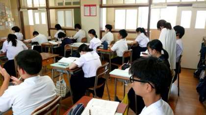 2年生数学の授業で2名の先生によるティームティーチングを実施中。皆さん文字式の活用の説明を聞きながら問題を解いています。説明中に疑問点をもう一人の先生に質問します。わからない箇所を放置せず、すぐに尋ねてくださいね。
