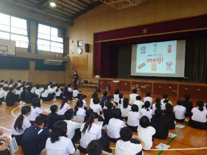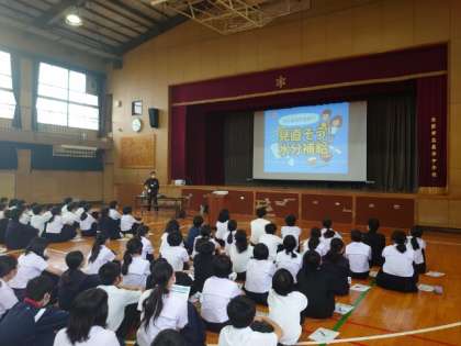 株式会社明治から講師の先生をお迎えし、熱中症予防講習会を行いました。生徒会の保健委員、運動部に入部した1年生が体育館に集まり、適切な水分補給をはじめ、熱中症予防について教わります。これから暑い日が多くなるので、しっかりお話を聞いてくださいね。