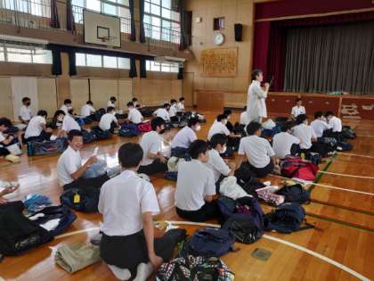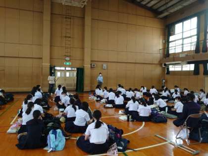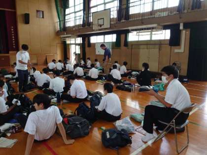 体育館では、3年生が修学旅行の最終確認中。皆さん、2日目の自然体験で着る私服が入っていますか?カヌーや湿原散策では、足元が濡れるかも。乾きやすい素材の方が良いかもしれませんね。帰ったら、改めて忘れ物が無いか確かめましょう。