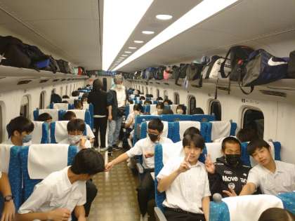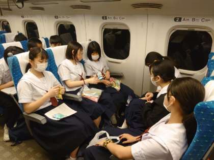 新幹線が新神戸駅を過ぎました。神戸を過ぎると、オヤツ解禁。皆さん、早速モグモグ頬張っています。