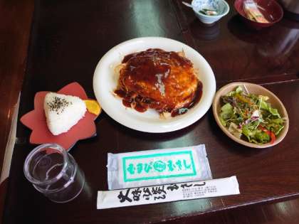 お昼ごはんは「むさし」のお好み焼きとおむすびです。皆さんニッコリ笑顔でいただきましょう。