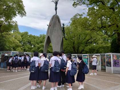公園内にある「原爆の子の像」を訪れます。折り鶴を捧げる少女のブロンズ像が象徴的です。