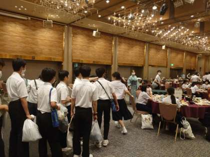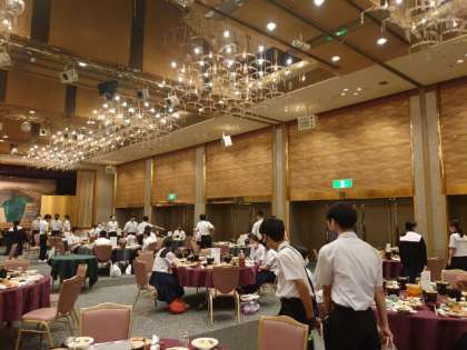 3、4組の皆さんが夕食会場にやってきました。1、2組さんは、平和資料館の入館が混雑したため、30分遅れて旅館に到着します。夜の活動の都合上、お先に夕食をいただきます。