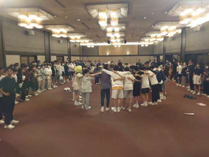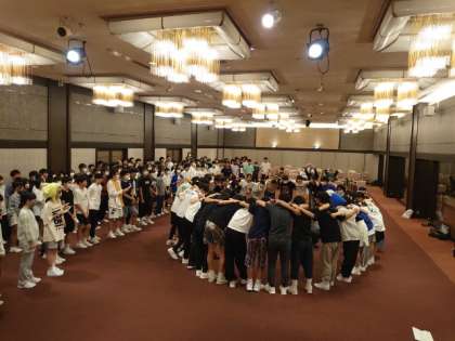 いよいよレクリエーションが始まります。まずは各クラスが優勝めざして気合いを注入。円陣を組んでエイエイオー!