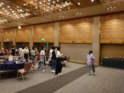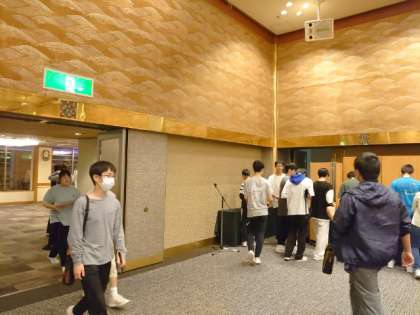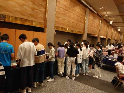皆さんが朝食会場にやってきました。まずは水筒にお茶を補給。自然体験中の水分をキープします。たっぷり入れておきましょう。