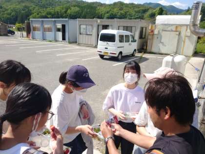 先生から練乳のおかわりをいただきます。お昼ごはんをいただいた後のフレッシュデザート。おなかいっぱい食べました。