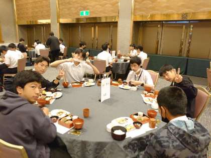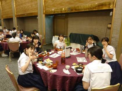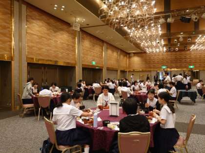 学年全体が揃ってごはんを食べるのは中学校生活で今日が最後かも。皆さん和気あいあいと朝食をいただいています。