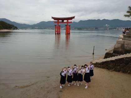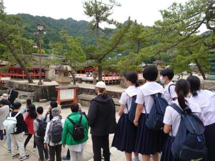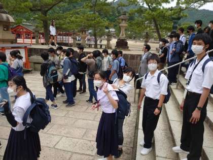 学級写真撮影後は宮島を自由散策。世界遺産の厳島神社に向かうグループもいるようです。