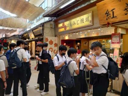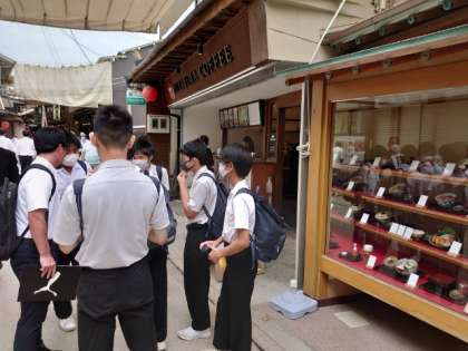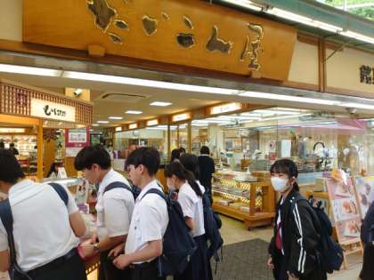 目にとまったお店をのぞいて、お土産を探したり、揚げもみじ饅頭を買い求めたり、それぞれ楽しんでいます。