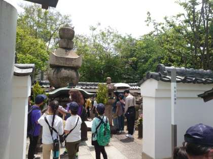 一行は一心寺へと向かいます。家康の子どもがお葬儀を執り行ったお寺です。大坂夏の陣で亡くなった家康の家臣、本多忠朝のお墓も見学しました。
