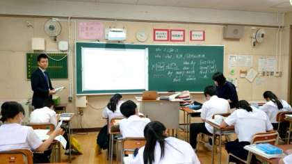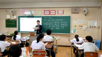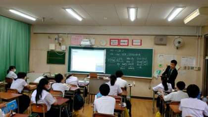 1年生英語の授業で教育実習の先生が授業を行っています。先生の指示で英語のドリルを解いていきます。間違えやすいポイントの説明を聞きながら、皆さん頑張って解いています。