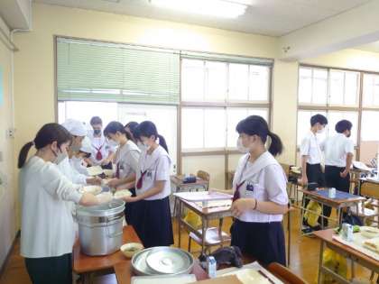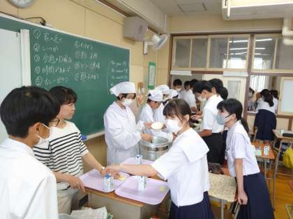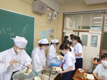 4時間目の授業が終わり、2年生の教室で給食の準備が始まりました。今日は「回鍋肉・中華スープ・キュウリのピリ辛あえ」の中華メニュー。回鍋肉の甘辛い味付けにご飯が進みそう。皆さん、ご飯のお代わりできますよ。