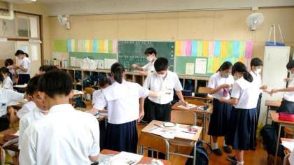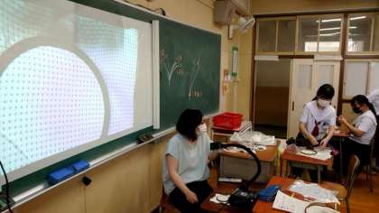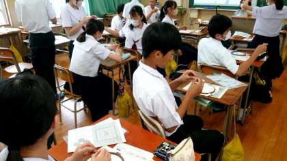 2年生家庭科でクロスステッチの実習が始まりました。糸が?の形にクロスするように刺繍針を刺していく技法だそうです。マス目に沿って針を刺すのでビギナーもチャレンジしやすそう。スクリーンに映されたお手本を見ながら、皆さん頑張ってください。