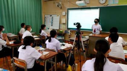 2年生英語の授業で英語のスピーチテストを行っています。夏休みの過ごし方について、あらかじめ考えた英文をみんなの前でスピーチします。内容や発音・表現など、いくつかの観点で評価するようです。皆さん身振り手振りを交えて頑張っています。