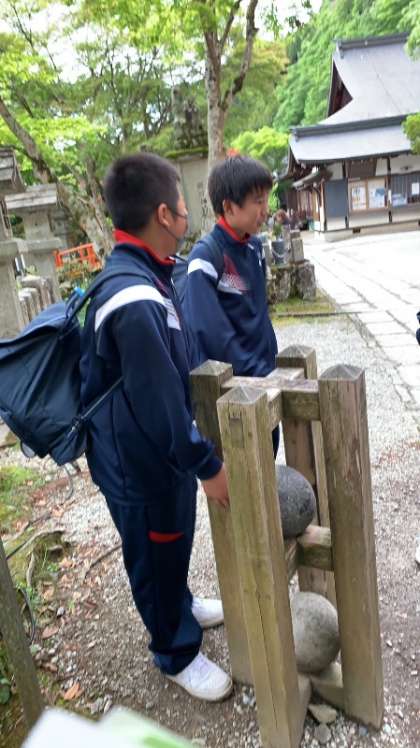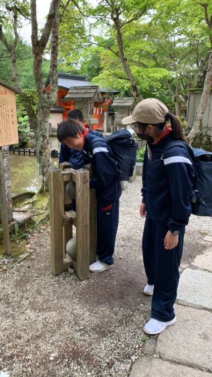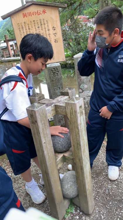 龍泉寺境内の「なで石」を持ち上げます。なでてから持ち上げると軽く感じるそうですよ。