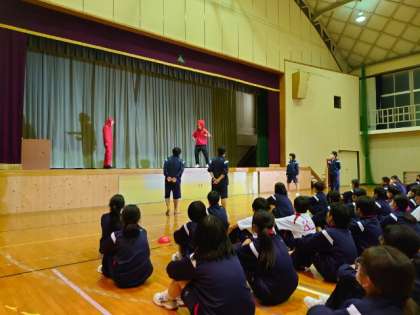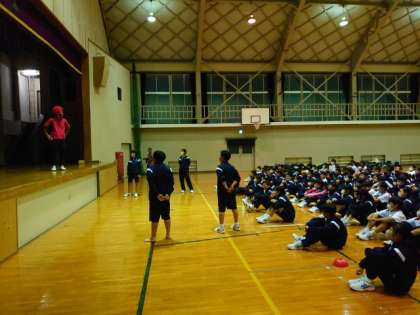 キャンドルファイヤーが終わり、レク係さんと先生のコントが始まりました。先生方も芸達者です。