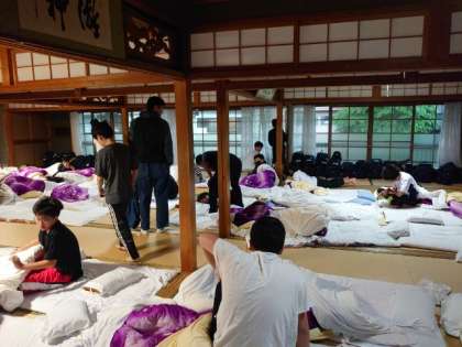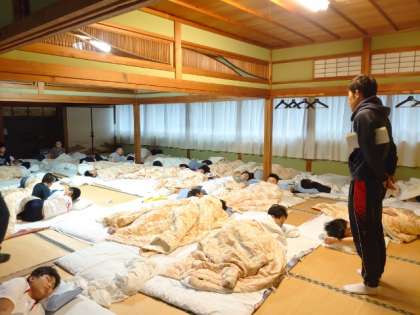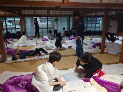 起床時刻になりました。部屋の電気を点けて「皆さんおはようございます」。眠い目をこすりながらお布団から起き上がります。