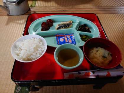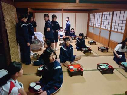 朝ごはんの時間になりました。桝源旅館定番の和朝食。女子の皆さんが協力して配膳中です。
