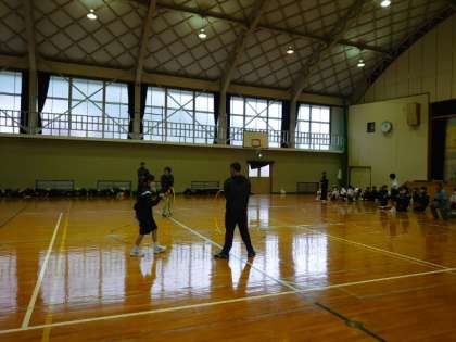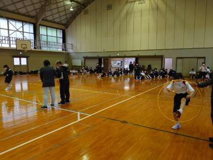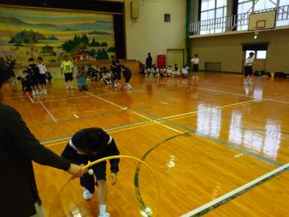プログラム2番は「スプーンリレー2」。昨日のレク大会よりもパワーアップ。リレー距離が長くなり、途中にフラフープを設けました。