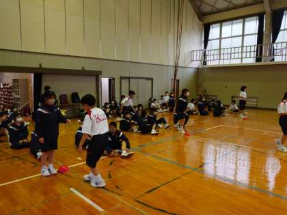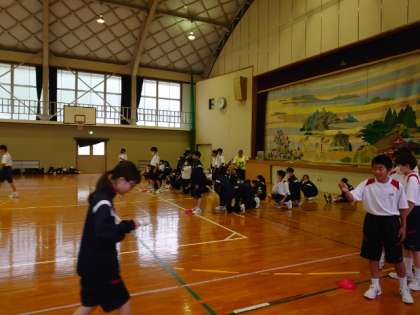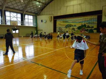フラフープをくぐり抜けるのが難しそうです。皆さん懸命にピンポン玉をつなぎます。