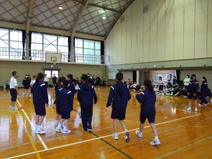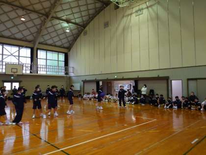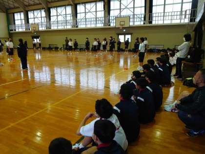 体育館内にコートを2面設け、ゲームを行っています。