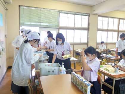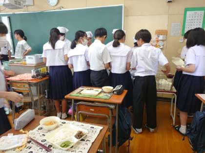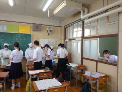 4限の授業が終わり、給食の準備が始まりました。2年生の皆さんも協力して配膳中。今日の献立は「青椒肉絲・ハムと野菜の中華スープ・枝豆」。枝豆はビタミンB1・B2をはじめ、多くの栄養素が含まれ、疲労回復や夏バテ防止に役立つとのこと。皆さん、しっかりいただきましょう。