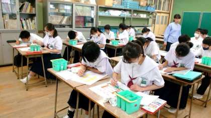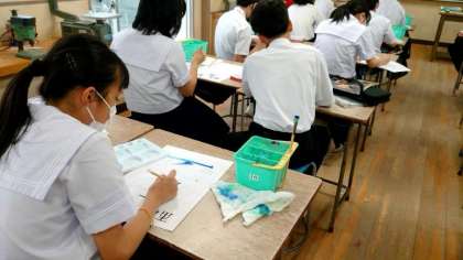 1年生美術の授業で「絵文字・レタリング」作品を制作中。イラストを交えて1つの文字を描きます。色の使い方で文字のイメージが変わりますね。皆さんの作品は文化祭で展示するとのこと。力作を楽しみにしています。