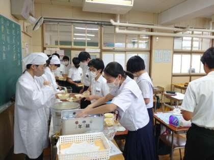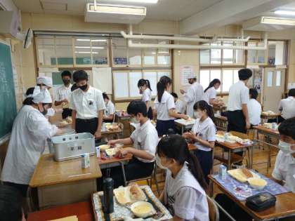 お昼休みになり、3年生の教室では給食の準備が行われています。今日は「カボチャのクリームシチュー・茹でキャベツ・梨」の洋風メニュー。しっかり煮込んだカボチャが甘くて美味しいですね。好きな人はお代わりしてください!