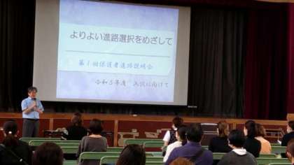 PTA総会に続き、3年生保護者対象に進路説明会を開きました。進路選択から決定に向けたスケジュールや私立高校受験の特徴(専願・併願)など「進路の手引き」の冊子をもとに説明がありました。何かご質問がありましたら、いつでも学校に連絡してください。