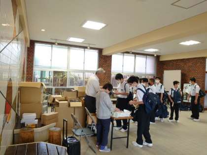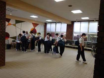 玄関ピロティで水着の販売を行っています。水着や帽子、ゴーグルにラッシュガードなど、水泳の授業で使う物品が売られます。今日は男子用、明日は女子用を販売する予定です。皆さん、持ち物への記名をお願いします。