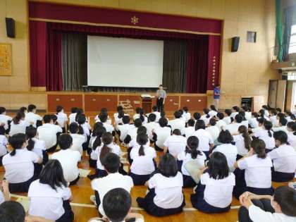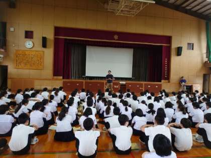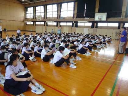 2年生の皆さんが体育館に集まり、明日の校外学習の説明を聞いています。1日乗車券を使って市内の施設をグループ単位で巡ります。8時20分に体育館に集合だそうです。バスや地下鉄の乗車マナーを意識しましょうね。