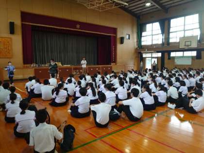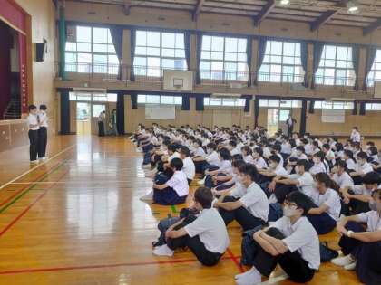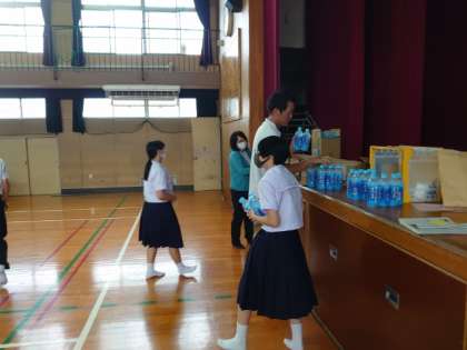 2年生の皆さんが校外学習の出発式を行っています。グループで協力して市内の各施設を計画通り巡ることを願っています。熱中症予防のドリンクも配られていますね。