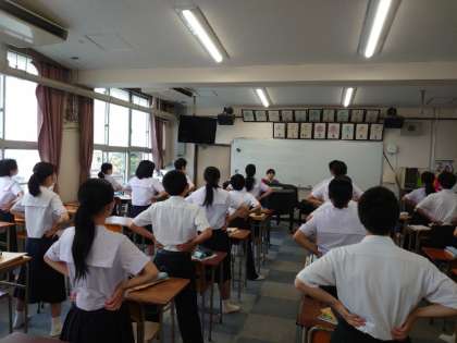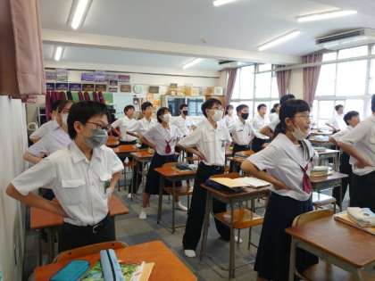 1年生の皆さんが元気に校歌を歌っています。音楽の授業の冒頭に発声練習を兼ねて歌います。皆さん腰に手を添えて、良い姿勢を保つよう意識しています。上手く発声できていますか?