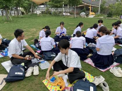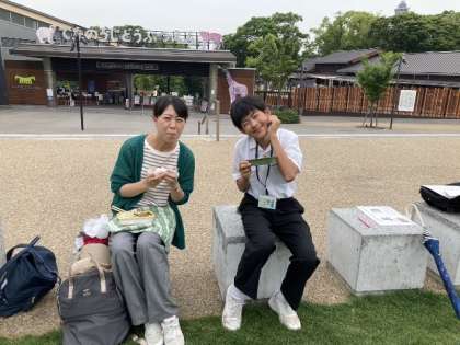 動物園を見学するグループが、てんしばでお弁当を広げています。雨が降っていなくて良かったです。